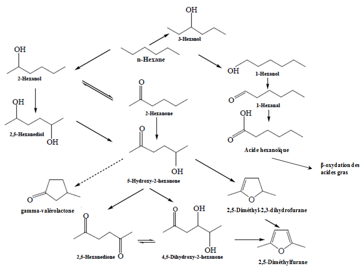 Le n-hexane est métabolisé principalement dans le foie, notamment par le système enzymatique des oxygénases à cytochrome P450, selon le schéma de la figure 1 (voir le schéma métabolique), en un certain nombre de composés alcooliques et cétoniques. L’oxydation en position 1 et 3 conduit à une détoxication ; en revanche, l’oxydation en position 2 génère quant à elle un métabolite toxique (bioactivation). Lorsque les concentrations inhalées dépassent 300 ppm pendant 8 heures, une saturation du métabolisme est observée chez le rat [6].