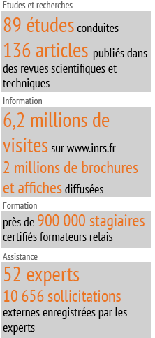 L’INRS regroupe 586 personnes (210 à Paris et 376 au Centre de Lorraine), aux compétences variées : ingénieurs, médecins, chercheurs, formateurs, juristes et spécialistes de l'information... Basé sur 2 sites (Paris et Lorraine), il propose des outils et des services adaptés aux :