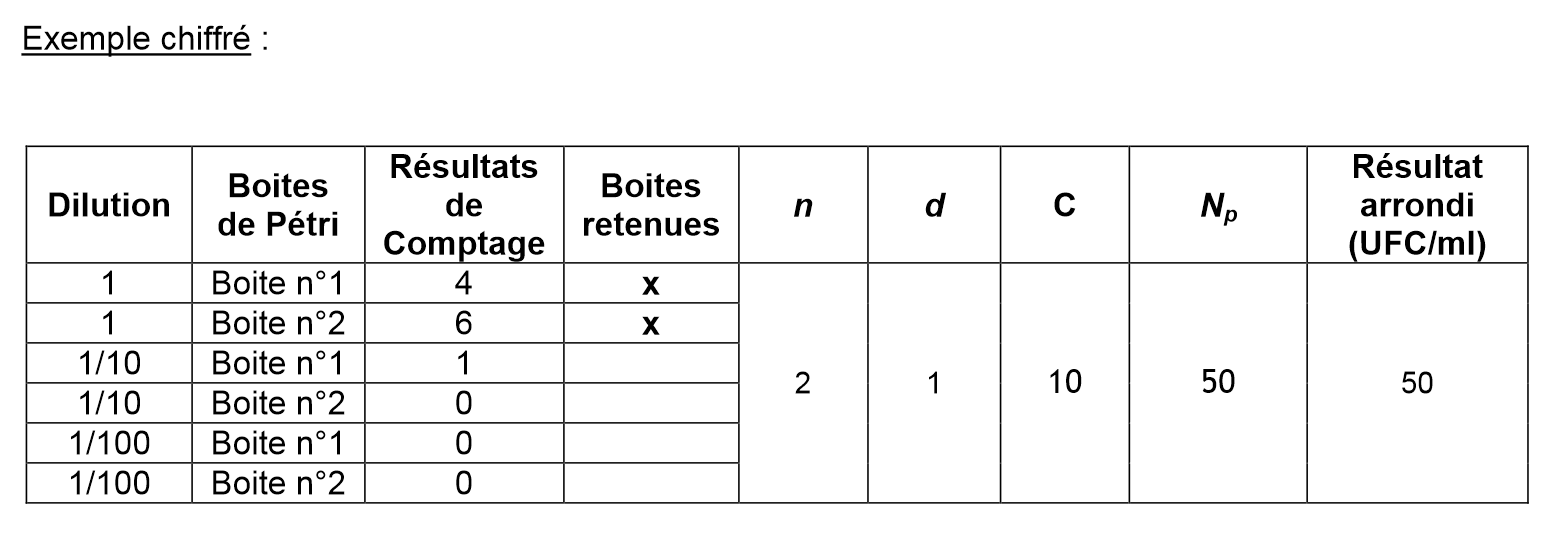 d : taux de dilution de la suspension étalée sur les boites de Pétri retenues pour le calcul. (d = 1 pour l’échantillon non dilué ; d = 0,01 pour la dilution au 1/100ième etc…).