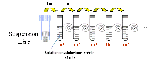 - La suspension mère est diluée successivement dans une solution physiologique stérile, par exemple de tryptone sel (TS).