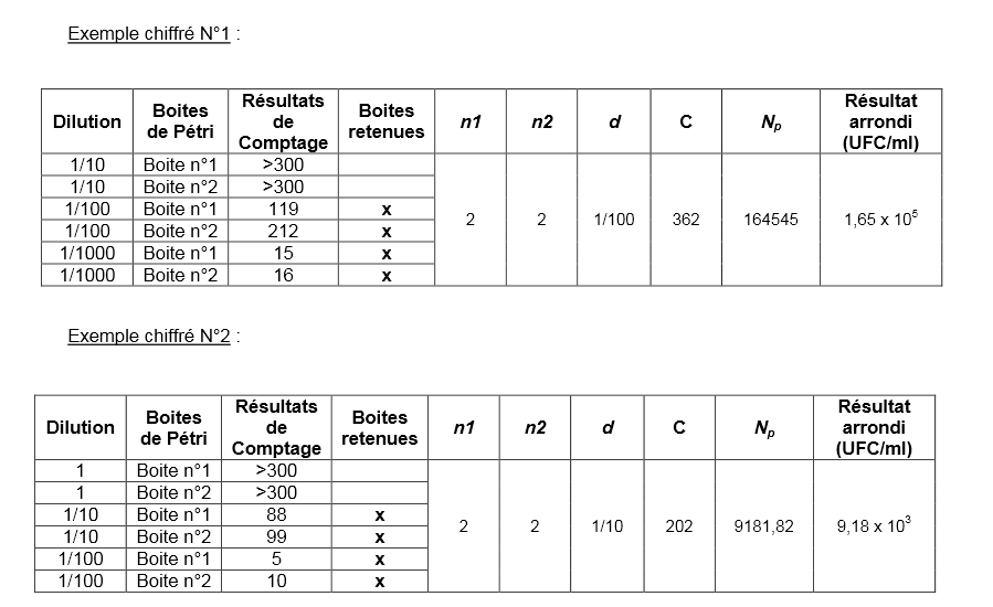 C : nombre d’UFC (unités formant colonies) observées sur l’ensemble des boites sélectionnées et exploitables (boites provenant de deux dilutions successives et dont au moins une contient 15 colonies ; seules les boites correspondant à un nombre d’UFC inférieur ou égal à 300 sont considérées dans le calcul)