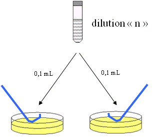 - Chaque dilution est étalée sur deux boites de milieu et pour au moins trois dilutions successives.
