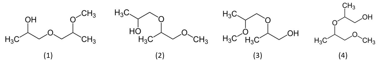 Le nom chimique (2-méthoxyméthyléthoxy)propanol, couvert par le numéro CAS 34590-94-8, comprend 4 isomères ; ces 4 isomères sont présents dans le produit commercial, en général dans les proportions suivantes :