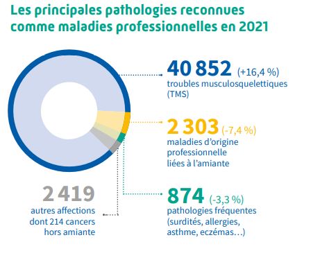 (- 4,3 %). Les troubles musculosquelettiques représentent à eux seuls 86 % des maladies professionnelles reconnues. Il est par ailleurs à noter que 2 183 cas de Covid-19 ont été reconnus en maladie professionnelle.