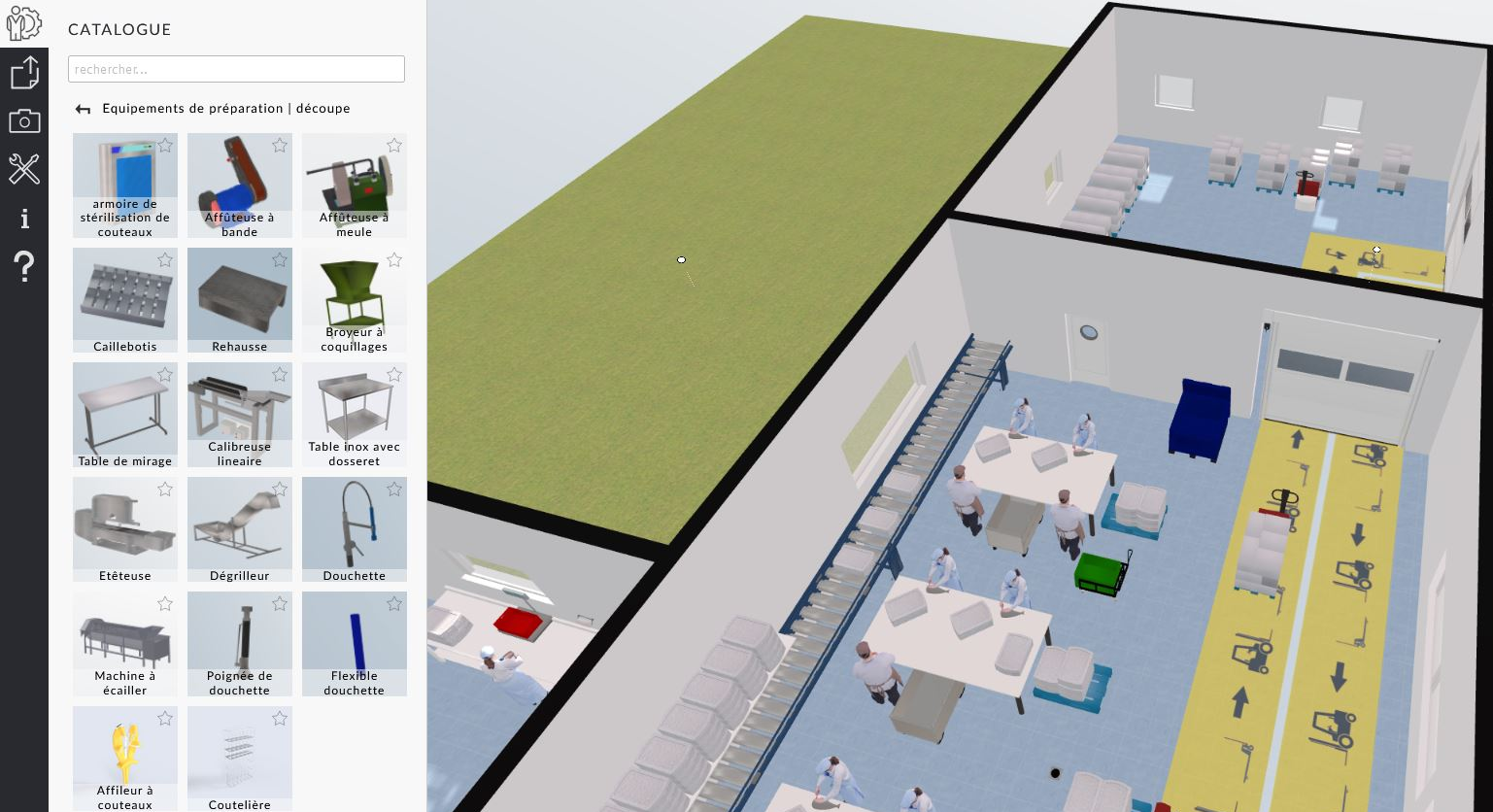 Tout comme les applications déjà disponibles pour d’autres secteurs d’activité (cf. encadré) Mavimplant Mareyage propose aux utilisateurs de concevoir leur espace de travail au sein d’une maquette 3D, en y intégrant des mobiliers et des équipements prédéfinis : fileteuses, peleuses, rayonnages, convoyeurs…
