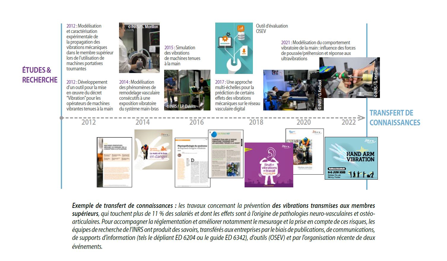L’activité de recherche se prolonge en effet par le transfert des connaissances obtenues, vers leurs bénéficiaires (entreprises, préventeurs et services de prévention et de santé au travail) : articles dans des revues, organisation d’événements, fiches décrivant des méthodes d’analyse, contribution à la normalisation, mise à disposition de logiciels, données d’entrée pour la rédaction d’une brochure, de vidéos, de contenus de formation, valorisation technologique… autant d’exemples qui illustrent la complémentarité des activités de l’INRS et de ses 4 modes d’action (assistance, études et recherche, formation et information).