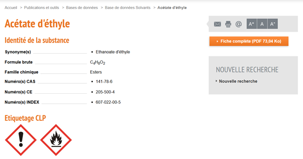 Pour accompagner les entreprises dans leur démarche de prévention, l’INRS propose la base de données Solvants, qui rassemble des informations pratiques sur plus d’une centaine de solvants, parmi les plus utilisés. Il permet aux acteurs de la prévention et aux utilisateurs de solvants de s’informer, pour un solvant donné, sur la classification et l’étiquetage selon la réglementation européenne, la classification du Centre international de recherche sur le cancer (Circ), les valeurs limites d’exposition professionnelle (VLEP), les propriétés physico-chimiques et les tableaux des maladies professionnelles du régime général notamment. Cet outil renvoie également vers des fiches d’information de l’INRS (fiches toxicologiques, fiches Métropol…) pour aller plus loin.