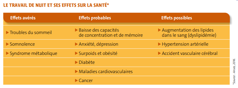 Travailler régulièrement de nuit peut altérer la santé des salariés. Les connaissances actuelles montrent que le travail de nuit, augmente les risques de troubles du sommeil et de pathologies psychiques, de troubles métaboliques et de maladies cardiovasculaires et favorise l’apparition de certains cancers.