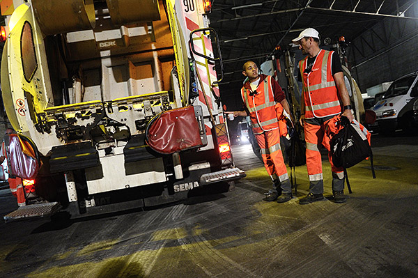 Un tuteur accompagne un rippeur en formation lors de ses premières tournées de ramassage des ordures. Avant le départ, ils vérifient ensemble l’état et le bon fonctionnement des équipements.