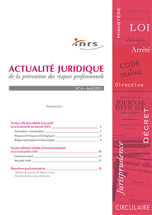 Ce bulletin d’actualité juridique ppropose une sélection des textes officiels (arrêté, décret, instruction, avis, circulaire, décision, directive, loi ou règlement) accompagnée pour chaque texte d’une synthèse du contenu du texte. Les textes sélectionnés pour ce numéro sont parus du 1er au 31 avril 2015 et sont relatifs à la santé et sécurité du travail (répartis en 4 catégories : prévention / généralités,situations particulières, risques chimiques et biologiques, risques physiques et mécaniques),