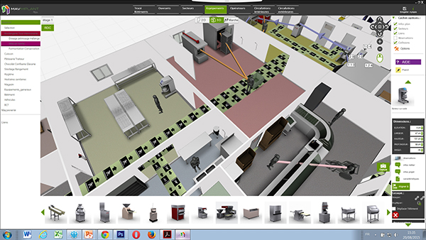 Des outils de mise en situation (visualisation du local en mode subjectif « comme si vous y étiez », simulation simplifiée de circulation d’engin…) viennent compléter les possibilités offertes par Mavimplant.