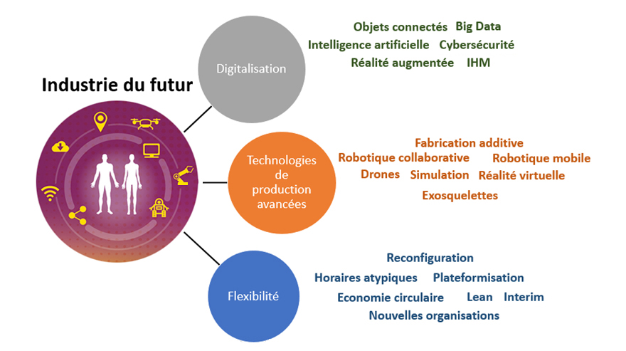 L’industrie du futur ou industrie 4.0, marque un tournant dans l’évolution du secteur industriel. Reposant sur l’intégration des nouvelles technologies, notamment numériques, dans l’ensemble de la chaîne de production, elle vise à associer flexibilité et productivité pour améliorer la compétitivité des entreprises. Avec ces évolutions, ce sont les modes de production, et donc l’activité des salariés, les collectifs de travail et de façon plus générale l’organisation du travail, qui sont impactés. Cela se traduit par une redéfinition des tâches et des rôles de chacun, de nouvelles procédures, de nouveaux métiers et de nouvelles compétences à acquérir.