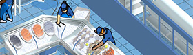 Les situations de travail illustrées portent sur : - la boulangerie-pâtisserie, - la boucherie-charcuterie et - la poissonnerie.