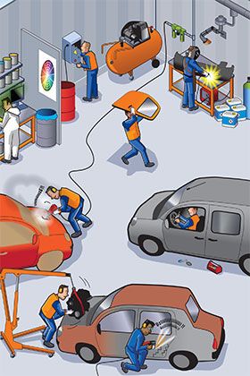 Les situations de travail illustrées portent sur : - la carrosserie-peinture, - la réparation mécanique et - le service rapide.