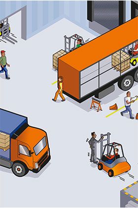 Les situations de travail illustrées portent sur : - la cour d'une entreprise de transport, - la cour et quai de chargement et de déchargement, - la route et - le milieu urbain.