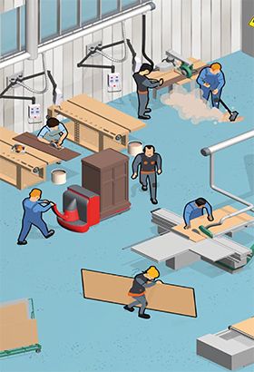 Les situations de travail illustrées portent sur : - la scierie, - la menuiserie et - la charpente.