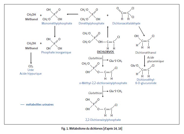 Deux voies métaboliques hépatiques sont proposées pour la transformation du dichlorvos (fig. 1): l’une est dépendante du glutathion; l’autre, qui est la voie majeure, ne l’est pas. Les études avec des molécules radiomarquées ont montré que :
