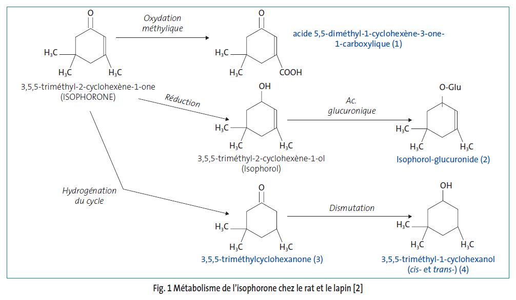L'isophorone est éliminée rapidement : le rat mâle, exposé par voie orale à de la 14C]-isophorone, excrète, après 24 h, 93 % des molécules radiomarquées majoritairement dans l'urine, mais aussi dans les fèces et l'air expiré; il reste 3,7 % dans le foie, 1,1 % dans les reins et 0,7 % dans les glandes préputiales (sous forme liée à l'α2u-globuline). Chez le lapin, une dose orale de 1 g/kg est éliminée dans l'air expiré et l'urine, partiellement sous forme inchangée et sous forme de 4 métabolites (voir fig. 1). Le rat excrète, dans l'urine, plus de 3,5,5-triméthylcyclohexanone (dihydroisophorone) et moins d'isophorol que le lapin.