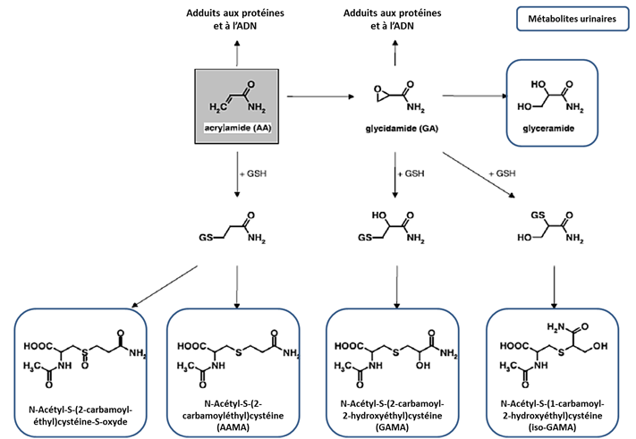 - Métabolisme : Comme chez l’animal, deux voies de métabolisation ont été identifiées. La principale correspond à la conjugaison avec le glutathion, à l’origine de la formation de cystéine-S-propionamide, avant une élimination sous forme d’acide mercapturique (AAMA) ou de son sulfoxyde. La seconde voie de métabolisation est la voie oxydative et conduit à la formation de glycidamide, un époxyde très réactif, à son tour réduit en glycéramide ou conjugué avec le glutathion en 2 isomères (GAMA et iso-GAMA). Après exposition orale, une relation dose-réponse peut être établie entre l’exposition et la formation d'adduits à l'hémoglobine (N- (2-carbamoyléthyl)valine (AAVal) et N-(2-carbamoyl-2- hydroxyéthyl)valine (GAVal)) ; après exposition cutanée, les deux adduits sont mesurés en quantité moindre. Les deux adduits sont formés en quantités identiques et sont stables dans le temps. De nombreux autres adduits à l’hémoglobine ont été identifiés chez l’homme [12]. Une relation dose-effet est retrouvée entre les taux d'adduits à l'hémoglobine formés et les effets neurologiques périphériques. En dessous d'un taux d'adduits à l'hémoglobine de 0,3 nmol/g d'hémoglobine, aucun signe neurologique n'est observé [17]. Aucun adduit à l’ADN n’a été mis en évidence chez l’homme jusqu’à ce jour [12].