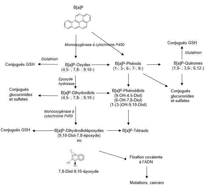 Le B[a]P peut être transformé en une vingtaine de métabolites oxydés et en un grand nombre de composés conjugués. Son métabolisme a lieu principalement dans le foie et se déroule en plusieurs phases.