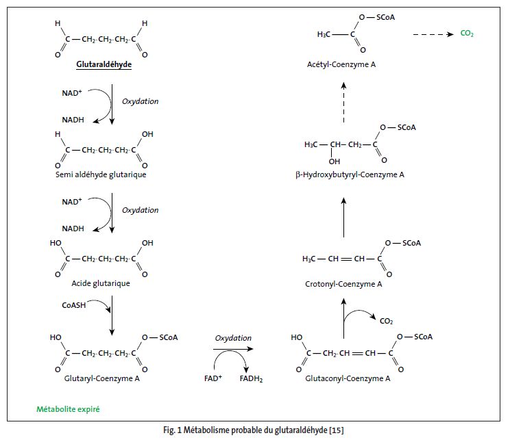 Le glutaraldéhyde est métabolisé préférentiellement en CO2 probablement par une série d’oxydations, décarboxy­lations et hydrolyses (voir fig. 1) ; les métabolites urinaires détectés n’ont pas été identifiés.