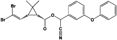Deltaméthrine | 52918-63-5 | 258-256-6 | 607-319-00-X | (1R, 3R)-3-(2,2-Dibromovinyl)-2,2-diméthylcyclopropanecarboxylate de (S)-α-cyano-3-phénoxybenzyle |