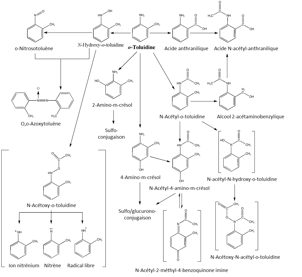 Chez le rat mâle, la voie majeure de métabolisation fait intervenir une N-acétylation et une hydroxylation sur le carbone 4 du noyau aromatique, avec formation de 4-amino-m-crésol, suivies d’une sulfo- ou glucuronoconjugaison. Des voies mineures passent par une hydroxylation en position 6, une oxydation du groupe méthyle et du groupement aminé [13]. La N-hydroxy-o-toluidine a été identifiée dans l’urine de rats, métabolite de l’o-toluidine probablement cancérogène au niveau de la vessie [14]. La N-hydroxy-o-toluidine peut être ensuite oxydée en nitrosotoluène dans le sang, entrainant la formation de méthémoglobine [15].