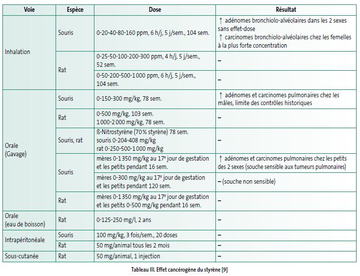 L’effet cancérogène du styrène a été testé chez le rat et la souris, par voies orale, inhalatoire, intrapéritonéale et sous-cutanée (voir tableau III). Les lésions induites de l’ADN et la cytotoxicité pulmonaire sont les deux mécanismes possibles de l’effet cancérogène du styrène. Les différences de métabolisme entre espèces pourraient expliquer les différences de sensibilité. Les souris ont un taux de cytochrome P450 (2E1 et 2F2) plus important au niveau des cellules de Clara pulmonaires et synthétisent, localement, une quantité plus importante d’oxyde de styrène responsable de l’essor de la prolifération cellulaire.