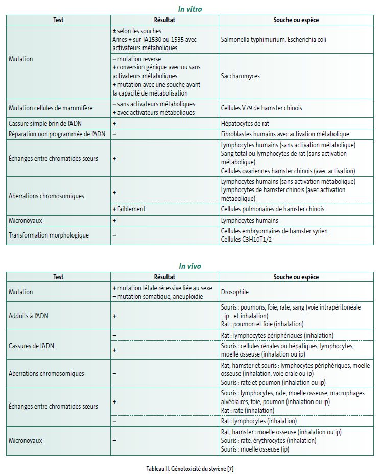 Le styrène possède un certain potentiel génotoxique in vitro et in vivo (voir tableau II) ; son métabolite principal, le styrène-7,8-oxyde, est considéré comme responsable de ces effets. Les lésions à l’ADN ainsi que la génotoxicité sont influencées par un polymorphisme génétique qui agit sur la quantité et l’activité des enzymes de détoxication de l’oxyde de styrène (époxyde hydrolase et glutathion S-transférase).