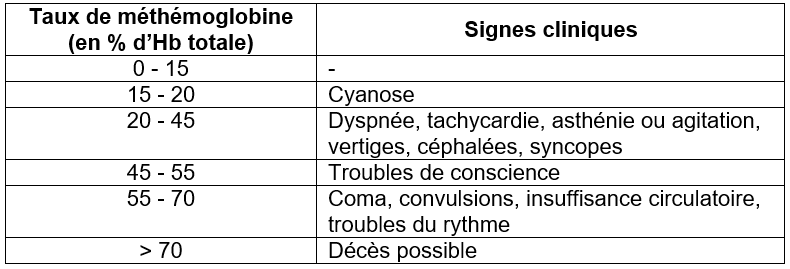 Rapidement après ingestion, apparaissent des signes d’irritation digestive (douleurs abdominales, nausées et vomissements) puis une cyanose cutanéo-muqueuse prédominant aux ongles, ailes du nez, pourtour des lèvres et des oreilles. La survenue d’autres symptômes est fonction du taux de méthémoglobinémie (cf Tableau 1). Au-delà d’un taux de 30 %, des symptômes cardio-respiratoires et neurologiques apparaissent, l’évolution peut être fatale.