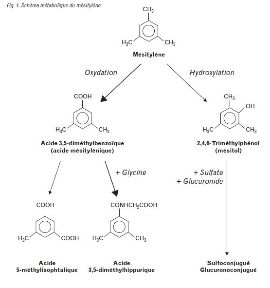 Ce dernier a été proposé comme indicateur biologique d'exposition chez l'Homme [12]. Une interaction a été montrée entre le mésitylène et le benzène chez le rat : le benzène stimule la transformation du mésitylène en acide 3,5-diméthylhippurique et le mésitylène stimule la transformation du benzène en phénol.