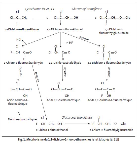 Le taux de transformation du 1,1-dichloro-1-fluoroéthane est faible chez le rat. Le métabolisme passe par une oxydation en présence de cytochrome P450 (voir fig. 1 page suivante).