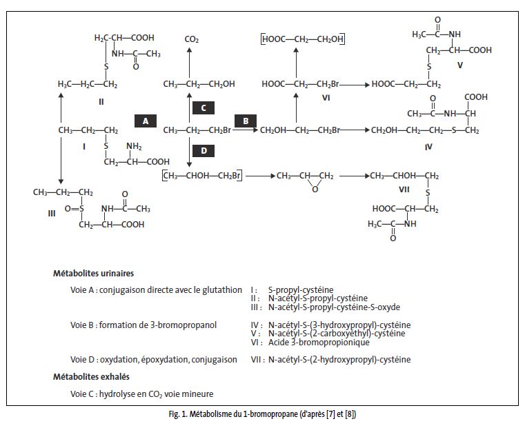 In vitro, le 1-bromopropane est oxydé par les microsomes de foie de rat en acide propionique qui, en présence de glutathion, produit du S-(1'-propyl) glutathion et du S-(2'- hydroxy-1'-propyl) glutathion [12].