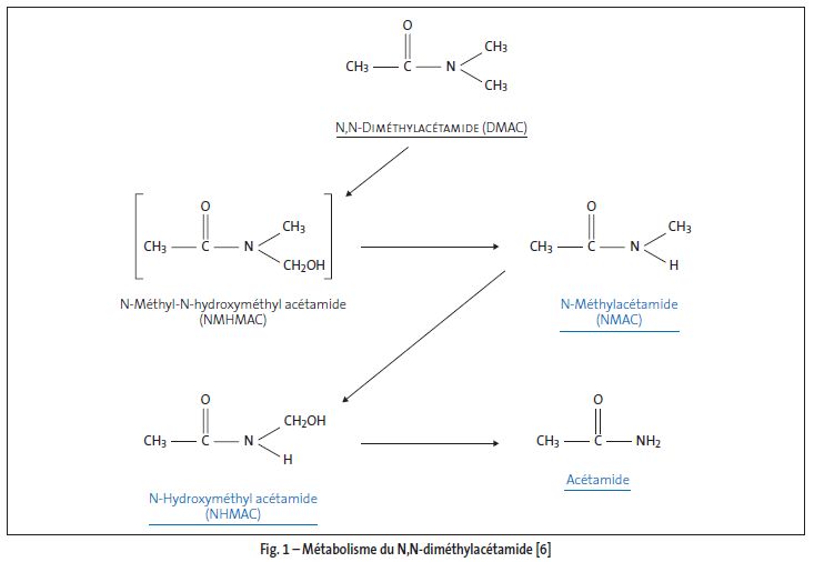 Chez le rat, la déméthylation du DMAC est saturable à des concentrations de 300 - 500 ppm ; chez l'homme, elle ne semble pas saturable jusqu'aux valeurs limites préconi­sées dans l'air [4].