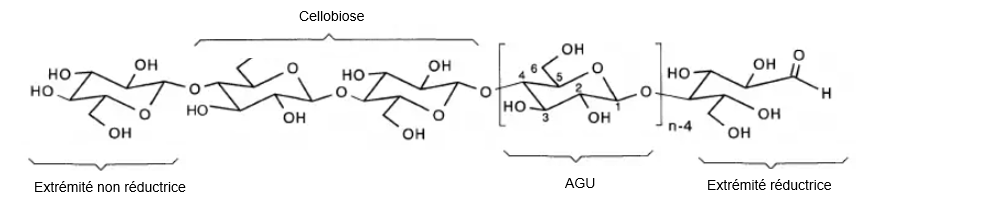 La cellulose est un polysaccharide de la série des β-D-glucanes. Sa structure, plane et linéaire, est constituée d’unités D-anhydroglucopyranose (AGU) liées par une liaison glycosidique β1-4. Son motif de répétition est le cellobiose (cf. Figure 1) [1].