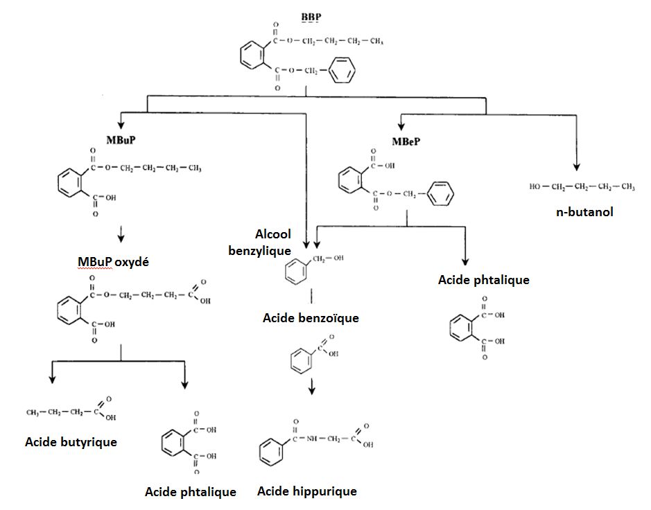Lors d’une exposition par voie orale chez le rat, le BBP est rapidement hydrolysé en monoesters (demi-vie très courte) au niveau du tractus gastro-intestinal et du foie, par des estérases, avec formation de phtalate de monobutyle (MBuP ou MnBP) et de phtalate de monobenzyle (MBeP ou MBzP) ; ces métabolites sont à leur tour métabolisés et /ou conjugués, avant d’être éliminés [13]. Les principaux métabolites formés sont le MBuP, l’alcool benzylique et l’acide hippurique ; parmi les métabolites secondaires, on peut citer le MBeP, l’acide phtalique ou le n-butanol [3].