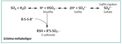 Le dioxyde de soufre est bien absorbé par voie respiratoire et rapidement hydraté en acide sulfureux. Celui-ci est distribué largement dans l'organisme où il est majoritairement métabolisé par le foie en sulfates, qui sont éliminés dans les urines.