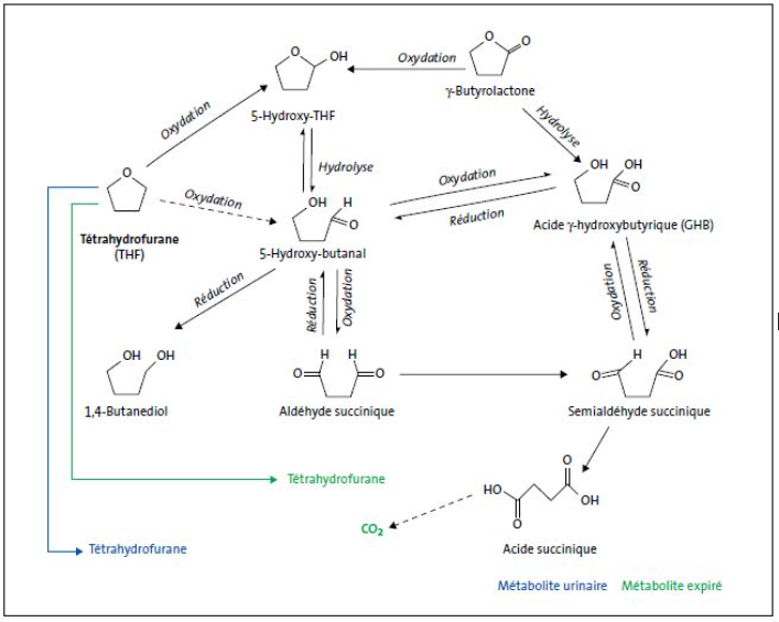 La détoxication serait due à une série d'oxydations et de réductions (voir fig. 1). Les intermédiaires étant instables, on ne peut que préfigurer le métabolisme. L'oxydation d'un carbone adjacent à l'oxygène produirait la γ-butyrolactone, puis par ouverture du cycle, l'acide γ-hydroxybutyrique, dont les effets neurologiques centraux cliniques et électriques sont semblables à ceux du tétrahydrofurane [16].