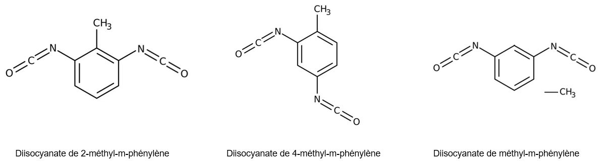 Sauf indication contraire, cette fiche traite du mélange TDI = (80 % 2,4-TDI) / (20 % 2,6-TDI).