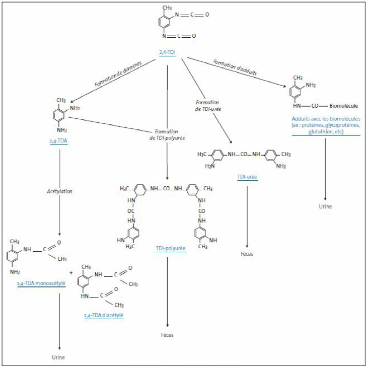 Le TDI est hydrolysé rapidement au niveau du tractus respiratoire en 2,4- et 2,6-toluènediamines (TDA), qui après passage sanguin, sont acétylées au niveau hépatique (réaction catalysée par la N-acétyltransférase) puis éliminées essentiellement par voie urinaire sous forme acétylée. De plus, le TDI forme des adduits avec les protéines plasmatiques (les demi-vies des adduits sont de 10 et 21 jours).