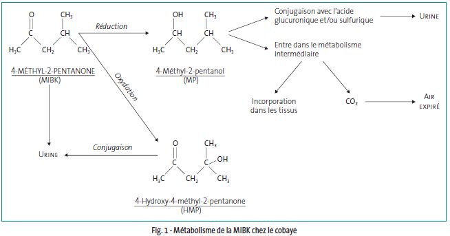 La MIBK est rapidement métabolisée. Chez le cobaye, la MIBK est transformée en 2 métabolites principaux : le 4-méthyl-2-pentanol (MP) et la 4-hydroxy-4-méthyl-2-pentanone (HMP) (cf. Fig. 1).