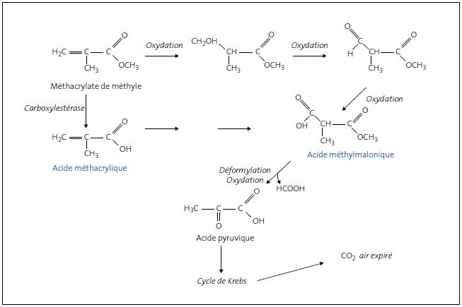 - la deuxième, sous l'action d'une carboxylestérase, aboutit à une hydrolyse avec formation de méthanol et d'acide méthacrylique ; ce dernier, conjugué à l'acétyl-coenzyme A, entrerait dans le métabolisme des lipides ;