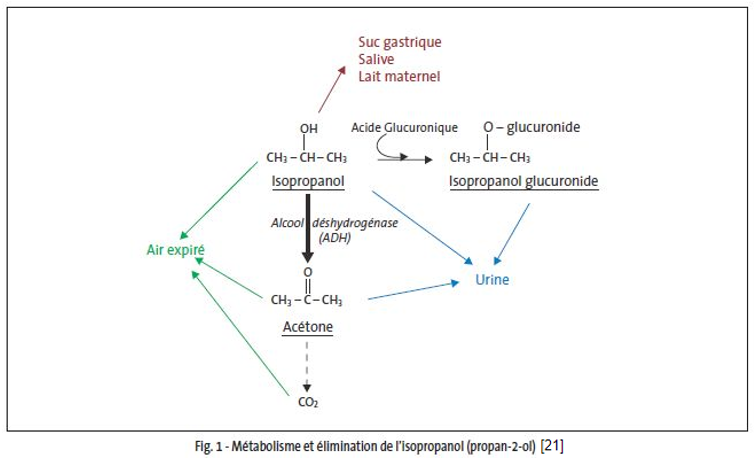 Le métabolisme et l’élimination du propan-2-ol sont résumés dans la figure 1. Il est oxydé en acétone dans le foie du rat, du chien et du lapin par l’alcool deshydrogénase (ADH). Chez le rat, la voie métabolique oxydative est saturable à des concentrations inhalées > 4000 ppm (9840 mg/m3) et retardée par la présence d’éthanol, meilleur substrat de l’ADH. Chez le lapin (750 ou 1300 mg/kg, i.v.), 64 à 84 % de la dose sont oxydés en acétone ; une partie du propan-2-ol (10,2 % d’une dose de 3000 mg/kg, orale) est transformée en isopropanol glucuronide.