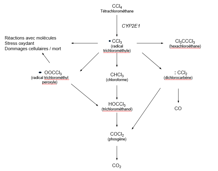 Le tétrachlorométhane est essentiellement métabolisé dans le foie, mais aussi au niveau des reins, des poumons et d’autres tissus riches en cytochrome P450 (CYP) [20]. Environ 50 % du tétrachlorométhane est transformé en radical trichlorométhyle, majoritairement par le CYP 2E1. Suivant les conditions (aérobie ou anaéorobie), ce radical peut alors être métabolisé en hexachloroéthane, chloroforme puis trichlorométhanol, ou en radicaux trichlorométhylpéroxyle et dichlorométhylcarbène. Les métabolites terminaux sont le phosgène (ou dichlorure de carbonyle), l’oxyde de carbone et le dioxyde de carbone (cf. figure 1).