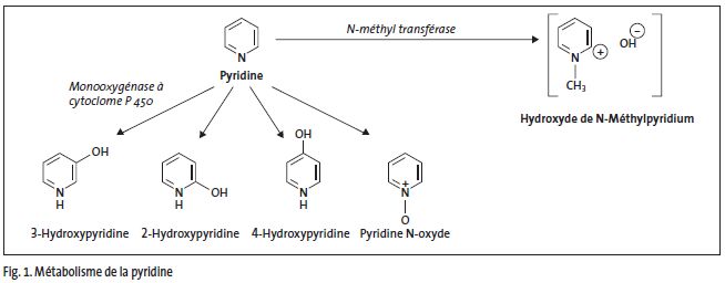 Les métabolites produits par le métabolisme oxydatif, mis en évidence in vitro avec des microsomes de foie, de poumon et de rein humains et de rat, sont retrouvés dans l'urine après exposition in vivo. La 3-hydroxypyridine est présente surtout chez la souris et sous forme de traces chez le lapin, la N-oxyde de pyridine chez le rat (10 % de la dose, injection intrapéritonéale), la souris et le cobaye (40 % de la dose, injection intrapéritonéale). Les 2- et 4-hydroxypyridine existent en quantités plus faibles dans les trois espèces.