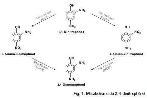 Le 2,4-dinitrophénol est métabolisé, chez l'Homme comme chez l'animal, par réduction des groupements NO2 (fig. 1). In vitro, des homogénats tissulaires de rat métabolisent le dinitrophénol avec des taux différents : foie (100 %) > reins (60 %) > rate (59 %) > cœur (29 %) > muscles (16 %) > cerveau (3 %) > sang (0 %). Chez le lapin, la rate est inactive.