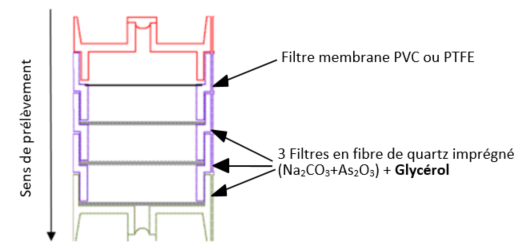 Note : Les 2 premiers filtres imprégnés sont désorbés ensemble. Le troisième filtre est désorbé seul pour objectiver un éventuel claquage (voir essais réalisés en piscine dans les données de validation).