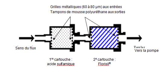 Un mélange de 500mg de Florisil® / acide sulfamique (95/5) est introduit dans la cartouche et maintenu entre une grille métallique à l'entrée et un tampon de mousse polyuréthane à la sortie.