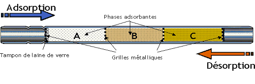 Les trois plages sont disposées par pouvoir absorbant croissant et séparées par des tampons de laine de verre désilanisée.Deux phases graphitées et un tamis moléculaire. L'echantilloneur est dopé avant le prélèvement avec un ou plusieurs étalons internes.