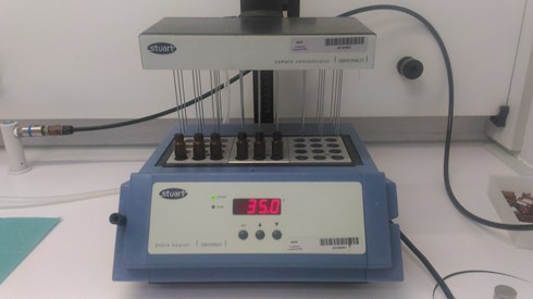 - Déposer les flacons, sans leur bouchon, dans les blocs de l’évaporateur prévu à cet effet (T=35°C, débit d’azote 0,4 PSI).(Voir photo 2)